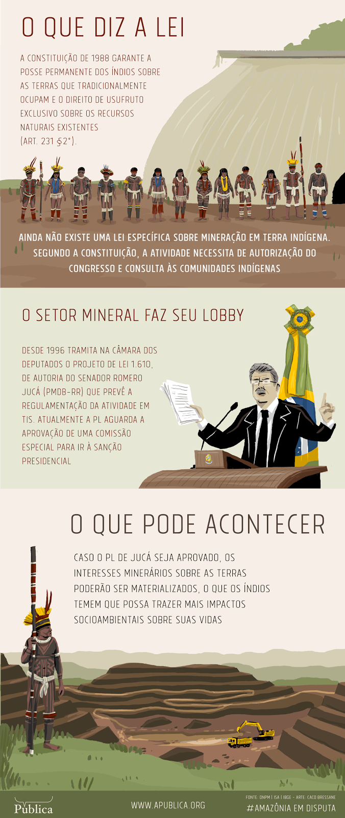 Em 2014, procuradores do MPF-Pará recomendaram ao DNPM que indeferisse todos os requerimentos de pesquisa e lavra mineral que incidissem em terras indígenas, pela ausência da regulamentação do tema pelo Congresso. A Funai defende a mesma posição ao alegar em nota que a “atividade de mineração em terras tradicionalmente ocupadas pelos indígenas, independente da fase do procedimento administrativo, é ilegal”.