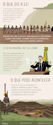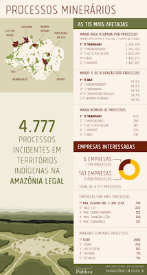 Levantamento da Pública com base em dados do Instituto Socioambiental (ISA) e do DNPM mostra que a mineração, uma atividade que sobrevive do proveito da terra, sobretudo a inexplorada, está cada vez mais atraída pelos territórios indígenas do Brasil. Na Amazônia Legal, por exemplo, região que engloba nove estados, um terço das áreas indígenas tem processos desse tipo, que vão do desejo de explorar ouro, diamante e chumbo a minérios como cassiterita, cobre e estanho. Nessa região, a proporção é de uma terra indígena para cada dez processos minerários. Campeão nacional, o Pará concentra 50% desses processos em TIs já identificadas oficialmente pela Funai.
